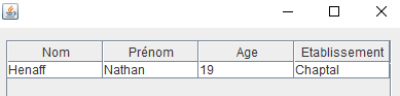 Object [][] data = new Object [][] { {"Henaff", "Nathan", 19, "Chaptal"}, {"Henriot", "Titouan", 20, "Chaptal"}, {"Le Gars", "Thibault", 18, "Chaptal"} } String header[] = new String[] {"Nom", "Prénom", "Age", "Etablissement"}; tableModel.setDataVector(data, headers); jTable.setModel(tableModel);